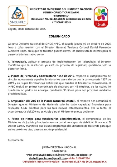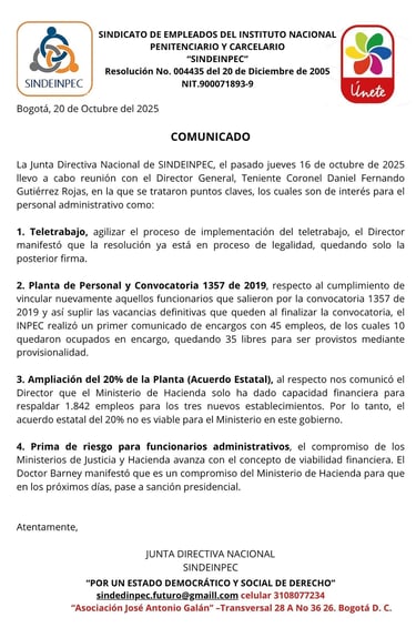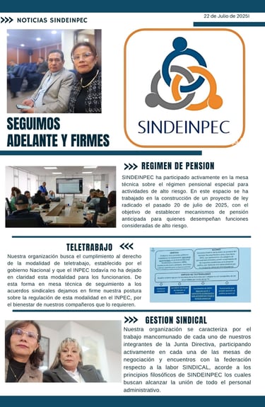 organización sindical en la defensa de los derechos laborales de los funcionarios administrativos del INPEC. Promovemos la union el empoderamiento y la participación activa en la toma de decisiones.